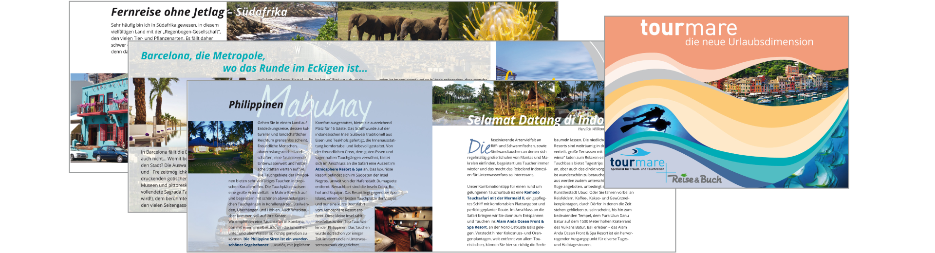 Das Keyvisual ziert die 1. Ausgabe des neu entwickelten tourmare Reisemagazins mit Reiseimpressionen, -empfehlungen und Kundenberichten. Es wird als Basismedium zur Information über die Fusion der beiden Unternehmen eingesetzt. Auch Internet-Auftritt und Anzeigengestaltung setzen auf den Wiedererkennungswert der fröhlichen Farbharmonien. Mit diesem Basispaket geht die neue tourmare im Juli 2014 unter dem Motto Spezialist für Traum- und Tauchreisen an den Start.